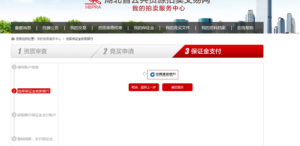 (2)选择保证金支付银行 填写了银行账户信息后,点击“确定提交”(系统已默认银行,点击确定提交即可)
